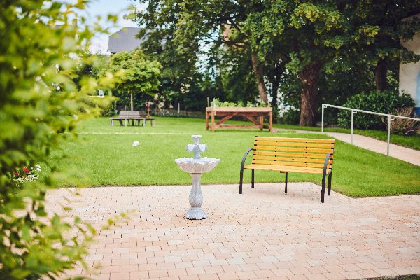 Bei schönem Wetter lädt Sie unser Garten mit einer großen Terrasse und zahlreichen Sitzmöglichkeiten zum Verweilen ein. An den liebevoll angelegten Hochbeeten können Sie gerne mitgärtnern.