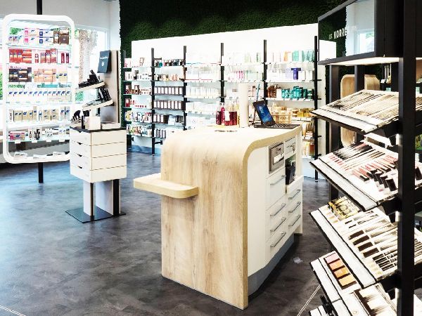 Baby- und kinderfreundliche Apotheke - mit extra Beratungstisch für Eltern mit Kindern, Spieleecke