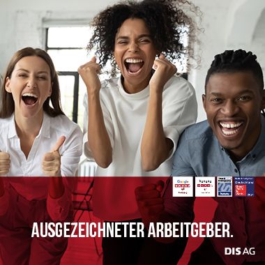 Die DIS AG wurde bereits zum 20. Mal im Wettbewerb Deutschlands Beste Arbeitgeber vom Institut Great Place to Work® ausgezeichnet und erhielt 2025 zum 4. Mal den kununu Top Company Award. Unser Service wird mit 4,5 bei Google* und mit 4,2 bei kununu* bewertet. Entdecken Sie jetzt unsere vielfältigen Stellenangebote!