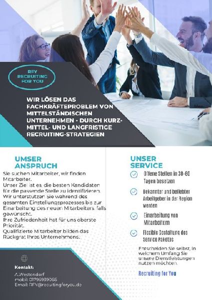 RFY Recruiting for You ist eine spezialisierte Boutique-Agentur, die sich auf den Lebensmitteleinzelhandel konzentriert. Wir bieten einzigartige Recruitment- und Videomarketing-Dienstleistungen an. Unsere exklusive Fokussierung auf wenige Kunden und Rollen garantiert unübertroffenen Service und persönliche Betreuung. Unsere Mission: Die besten Arbeitnehmer mit den Top-Arbeitgebern zu vereinen! Wir stärken Ihre Arbeitgebermarke, fördern ein gutes Betriebsklima und steigern die Motivation und Produktivität Ihrer Mitarbeiter / Mitarbeitergewinnung/Personalberatung/Recruiting/Employer Branding/Personalvermittlung Lebensmittelbranche/Fachkräfte Lebensmittelindustrie/Lebensmitteleinzelhandel Recruiting