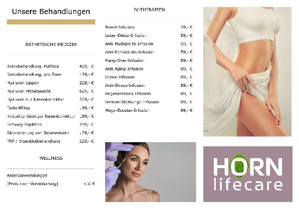 Wir von Horn lifecare kümmern uns um Ihr inneres und äußeres Wohlbefinden. Unsere Philosophie ist, dass nur ein zufriedener Mensch auch äußerlich strahlen kann und umgekehrt. Unsere Expertise widmen wir Ihrer individuellen Situation! Ihre Wünsche werden aufgenommen, besprochen und mittels unseres geschulten Teams umgesetzt. Sie können sich vertrauensvoll fallenlassen.