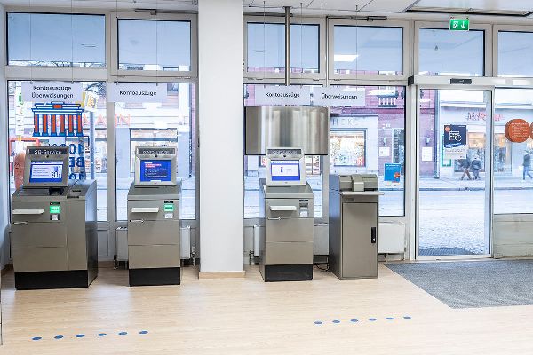 Der SB-Bereich ist von 06:00 bis 23:00 Uhr zugänglich. Ein Außen-Geldautomat ist vorhanden.