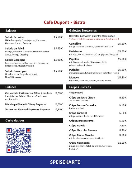 Mittags Bistro & Abend-Party CAFE DUPONT französischer Genuss im Herzen Münchens Seit über 15 Jahren belebt das Café Dupont das Westend mit seinem Bistro-Geist und Aromen aus der Ferne. Hier nimmt man sich Zeit: für einen Kaffee mit Freunden, ein hausgemachtes Tagesgericht, einen perfekt goldenen Crêpe. Auf der Karte eine einfache, großzügige französische Küche, voller Sonne und guter Laune. Jeden Mittag weht ein kleiner Hauch Paris durch unsere Teller. Feiern Sie etwas? Montag bis Samstag können Sie das Café Dupont für Ihren Geburtstag, Ihre Team-Party oder ein Firmenevent exklusiv mieten. Gesellige Atmosphäre, sanfte Musik, garantierte Lacher wie zu Hause, aber besser. Geöffnet von Montag bis Freitag: 10:00 15:00 Uhr