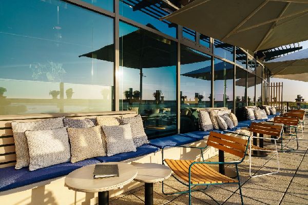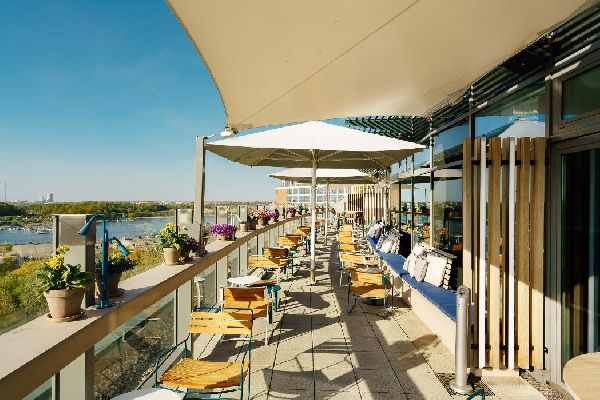 Erlebe die Hansestadt mal anders und lass´ Deinen Blick von unserer Rooftop Bar über Rostocks lebendige Straßen und die Warnow schweifen.