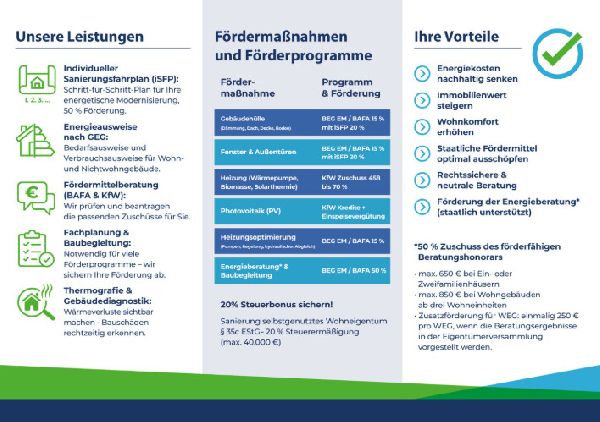 Mit unserer Expertise in Energieeffizienzberatung, Sanierungsfahrplänen und Wohnberatung sind wir Ihr zuverlässiger Partner auf dem Weg zu einer umweltfreundlicheren und kostensparenden Immobilie. Wir stehen für eine individuelle Beratung, die genau auf Ihre Bedürfnisse und Wünsche eingeht. Unsere Fachkenntnis ist Ihr Schlüssel zu einer nachhaltigen Zukunft.