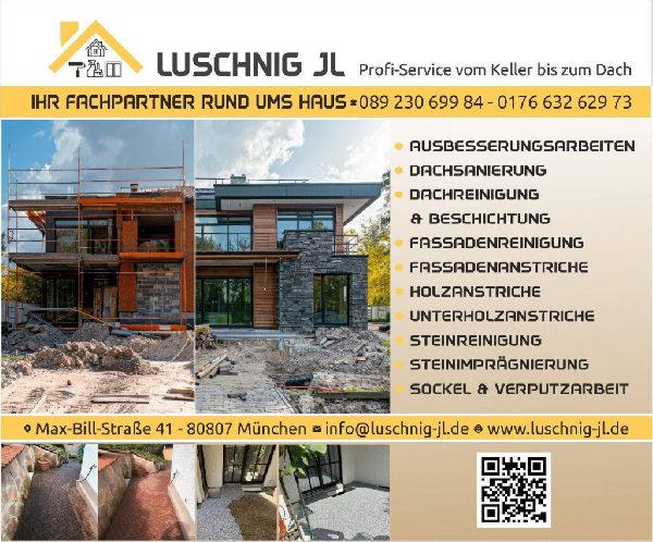 Luschnig JL Profi-Service, ansässig im Herzen von München, bietet seit der Gründung einen umfassenden Dienstleistungskatalog für Immobilien an. Von Fassaden- und Dachsanierungen über Fugentechnik bis hin zu alltäglichen Reinigungsarbeiten – unser vielseitiges Angebot deckt alle Bedürfnisse vom Keller bis zum Dach ab. Unser Ziel ist es, Eigentümern und Verwaltungen die bestmögliche Unterstützung zu bieten, um deren Immobilien in Top-Zustand zu halten.