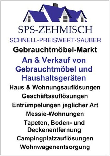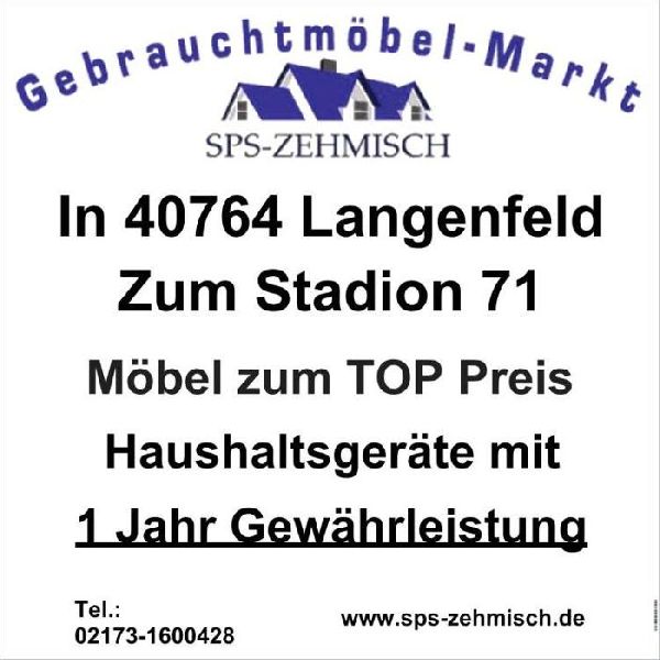 SPS-ZEHMISCH Gebrauchtmöbel-Markt Hans-Böckler-Str. 64, 40764 Langenfeld. Ständig wechselne Gebruchtmöbel im Sortiment sowie gebrauchte Haushaltsgeräte mit 1 Jahr Gewährleistung. Wir machen auch: Haus & Wohnungsauflösungen, Geschäftsauflösungen, Entrümelungen jeglicher Art, Messie-Wohnungen, Tapeten, Boden und Deckenentfernung, Campingplatzauflösungen und Wohnwagenentsorgungen. - Wir garantieren eine pünktliche und zuverlässige Auftragsabwicklung! Kostenloses und unverbindliches Angebot. An und Abfahrt sind kostenlos. Bis zu 100 % Wertausgleich. Festpreisgarantie. Vereinbaren Sie einen kostenlosen Besichtigungstermin.