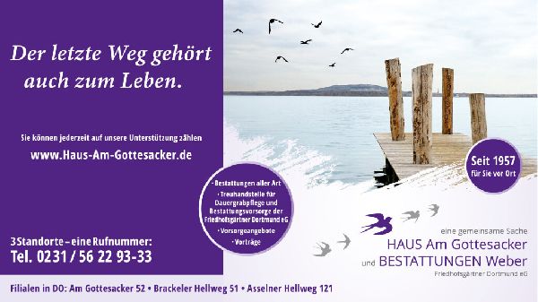 Wir wissen alle, dass irgendwann der Tag des Abschieds kommt. Ob es die eigenen Eltern, Partner, Verwandte oder sogar Kinder sind, man verliert einen geliebten Menschen aus seinem Kreis. Wir wissen nur, dass wir einen Bestatter für diese Angelegenheit benötigen. Das Team vom HAUS Am Gottesacker - Bestattungen Weber wird Ihnen bei diesem schweren Weg Rund um die Uhr behilflich sein und Sie begleiten, da dies für uns eine absolute Herzensangelegenheit ist. Da jeder Mensch individuell ist, gestalten wir auch jede Bestattung und Begleitung entsprechend der Bedürfnisse und Wünsche der Angehörigen.