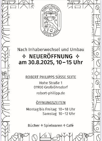Unsere Buch- und Spielwarenhandlung ist weit mehr als ein Geschäft sie ist ein Ort zum Stöbern, Genießen und Verweilen. Neben einer vielfältigen Auswahl an Büchern und Spielwaren für Jung und Alt laden wir Sie ein, frisch gemahlene Kaffeespezialitäten, selbstgebackenen Kuchen und unsere feinen süßen Gläschen zu probieren. Darüber hinaus geben wir Künstlerinnen und Künstlern aus der Region Raum, ihre Werke auszustellen, und schaffen mit regelmäßigen Veranstaltungen einen lebendigen Treffpunkt für Kultur und Begegnung. Ob zum Einkaufen, Genießen oder Inspirieren bei uns sind Sie herzlich willkommen.