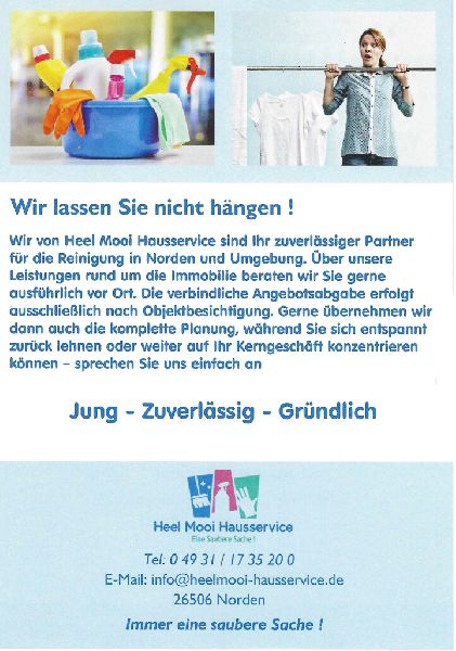 Wir von Heel Mooi Hausservice sind Ihr zuverlässiger Partner für professionelle Gebäudereinigung in Norden und Umgebung. Über unsere Leistungen rund um die Immobilie beraten wir Sie gerne ausführlich vor Ort. Die verbindliche Angebotsabgabe erfolgt ausschließlich nach Objektbesichtigung. Gerne übernehmen wir dann auch die komplette Planung, während Sie sich entspannt zurücklehnen oder weiter auf Ihr Kerngeschäft konzentrieren können – sprechen Sie uns einfach an.