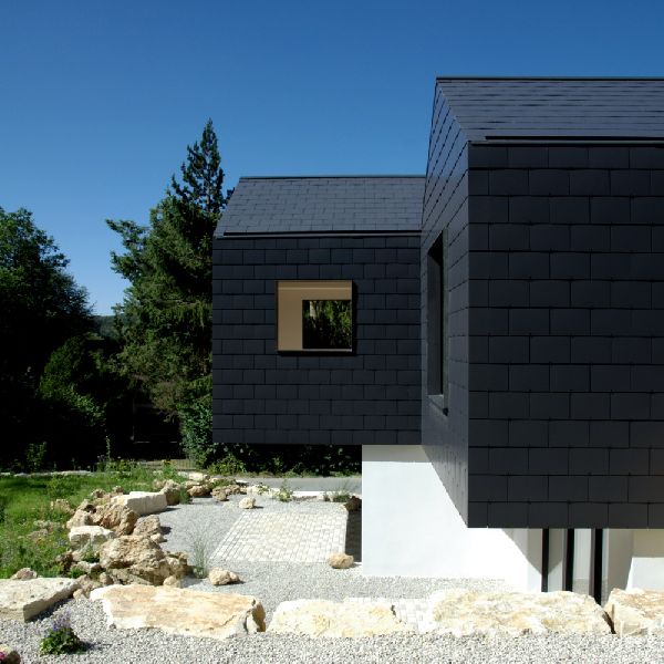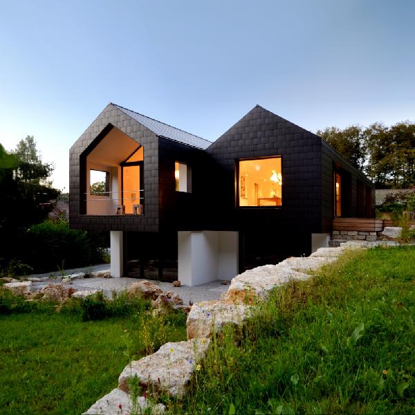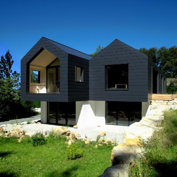 Architektur und Design im Einklang mit der Natur | In einem Hang eingebettet, fügt sich unser wohngesundes Bio-Ferienhaus zurückhaltend ins umliegende Hügelland des Naturparks Fränkische Schweiz (Bayern) mit Felsen und Buchenwälder ein.