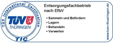 1998 erhielten wir zudem die Zertifizierung zum Entsorgungsfachbetrieb vom TÜV Thüringen.
