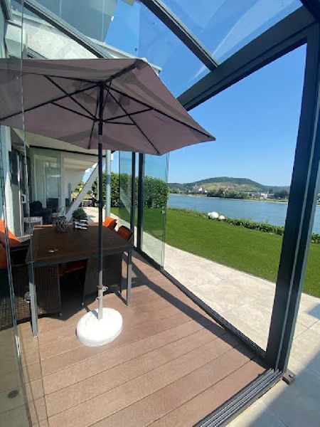 Jedes Zimmer bietet einen atemberaubenden Blick auf den Rhein, ergnzt durch einen lichtdurchfluteten Wintergarten und eine private Terrasse.