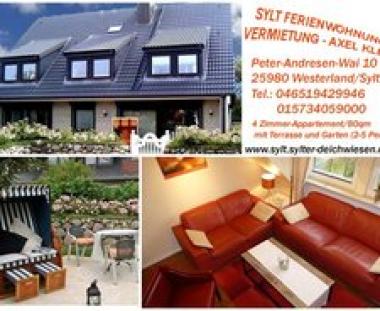 Sie buchen direkt online oder vor Ort: Peter-Andresen-Wai 1025980 Sylt / Westerland, Tel: 046519429946 oder 015734059000 ... weitere Informationen auf a href=http://www.facebook.com/FerienwohnungSyltSylterDeichwiesefacebook/a Wir vermieten Ihnen große 3 Sterne Ferienwohnung mit 4 Zimmern zum günstigen Preis mit Terrasse und Garten in Westerland auf Sylt für 2,3,4 oder 5 Personen in ruhiger und zentraler Lage in Westerland.