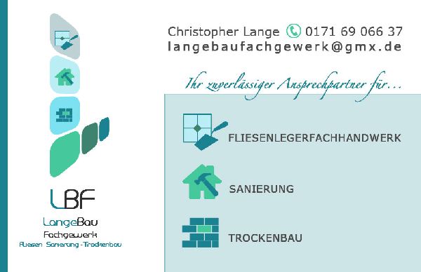 Wir von LBF Lange Bau Fachgewerk sind spezialisiert auf Fliesenlegerarbeiten und bieten das komplette Programm im Trockenbau. Sämtliche Aufträge werden mit größter Sorgfalt ausgeführt, damit Sie nach der Sanierung lange Freude mit Ihrer Immobilie haben. Fachmännisch verarbeitete Estriche sind beispielsweise die Grundlage für ein qualitativ hochwertiges Endprodukt. Um unser Leistungsangebot stetig erweitern zu können, werden alle Mitarbeiter regelmäßig geschult. Kontaktieren Sie uns für Ihr nächstes Bauvorhaben und lassen Sie sich von unserer Qualität überzeugen.