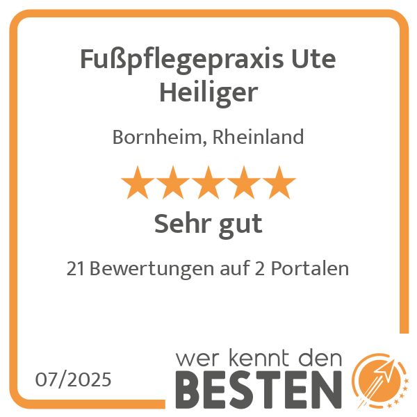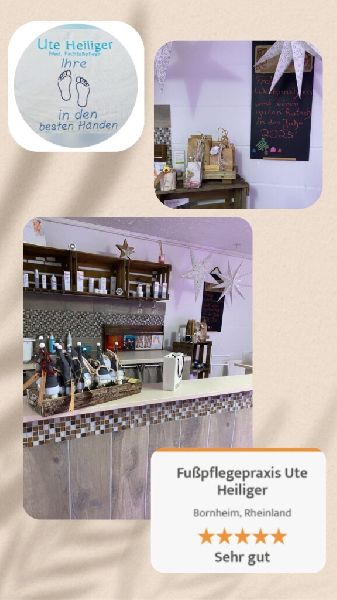Leiden Sie unter Fußbeschwerden und suchen dafür nach einer kompetenten Behandlung? Dann können Sie sich vertrauensvoll an mich wenden. Mein Name ist Ute Heiliger und ich habe mich mit meiner eigenen Fußpflegepraxis selbstständig gemacht. Ansässig bin ich in Bornheim, von wo aus ich Kunden in der Region mit einem zuverlässigen und freundlichen Service zur Verfügung stehe. Als mobile Praxis komme ich gerne direkt zu Ihnen, damit Sie ganz entspannt zu Hause bleiben können und keinen zusätzlichen Aufwand haben. Des Weiteren sehe ich eine hohe Zuverlässigkeit und stets faire Preise als selbstverständlich an.