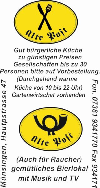 Unser Restaurant, Alte Post in Münsingen auf der schwäbischen Alb an der B 465, bietet durchgehend warme deutsche Küche. Als gemütliche Gaststätte für Jung und Alt bieten wir auch noch eine Gartenwirtschaft sowie eine Bierbar mit Raucherbereich.