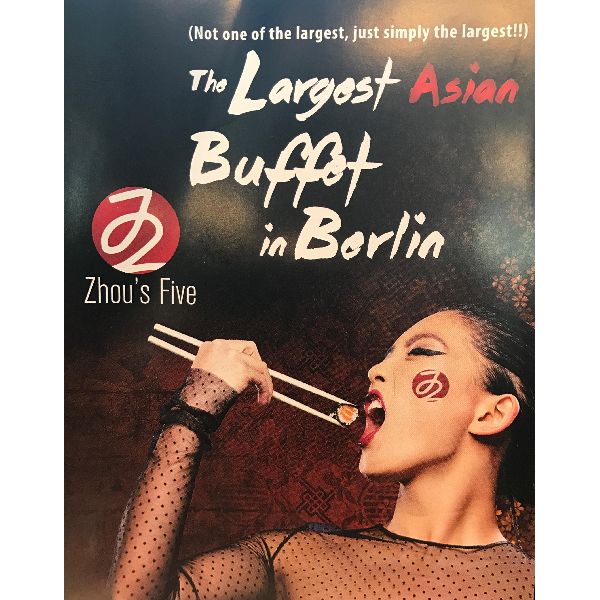 Das Zhou‘s Five Restaurant ist direkt im Victoria Center. Dort begrüßt Sie das eindrucksvolle 60m lange Buffet mit dem leckersten der 5 Nationen. Zhou‘s Five trifft als asiatisches Restaurant in Berlin den vollen Geschmack: Nicht umsonst sagen Gourmetkenner, dass die beiden Restaurants die wohl modernsten und vielfältigsten asiatischen Restaurants sind. Unser asiatisches Restaurant in Lichtenberg bietet eine Gesamtfläche von 2.500qm und sorgt für ein tolles, kulinarisches Erlebnis.