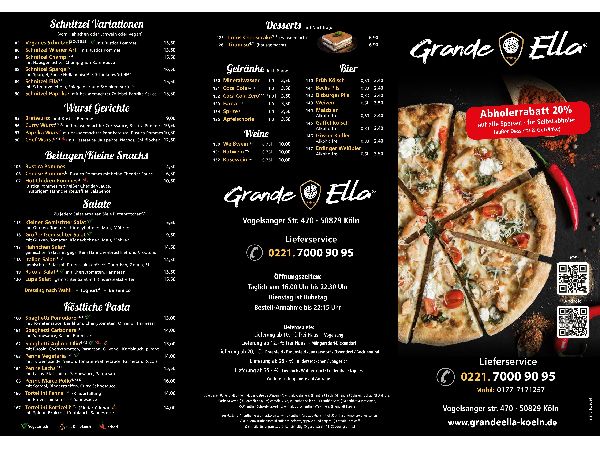Entdecken Sie die leckeren Speisen von Grande Ella Restaurant hier direkt oder über unserem Lieferservice. Genießen Sie köstliche Pizza, darunter auch vegane Varianten sowie American Style Pizzen. Probieren Sie unsere einzigartigen Burger, begleitet von frischen Rustica Pommes, oder lassen Sie sich von unseren besonders leckeren Schnitzelgerichten verführen. Für den kleinen oder großen Hunger bieten wir außerdem herzhafte Wurstgerichte, eine Auswahl an frischen, abwechslungsreichen Salaten und Pizzen oder Flammkuchen auf cremigem Crème-fraîche-Boden. Zum Abschluss erwartet Sie ein Tiramisu oder unser berühmter Lotus Cheesecake – die perfekte Abrundung für Ihr kulinarisches Erlebnis!