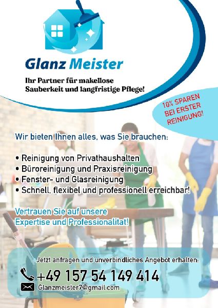 Glanz Meister steht im Herzen von Liederbach am Taunus als Synonym für makellose Sauberkeit und strahlenden Glanz in Ihrer Umgebung. Spezialisiert auf Gebäudereinigung, Fenster- und Glasreinigung sowie Büroreinigung, bieten wir unseren Kunden einen umfassenden Objektservice. Unsere Leistungen sind auf die individuellen Bedürfnisse jedes Kunden zugeschnitten, von Innenreinigung über Unterhaltsreinigung bis hin zur spezialisierten Kanzleireinigung.
