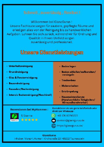 Glanzgurus steht seit seiner Gründung für höchste Qualität und Kundenzufriedenheit in den Bereichen Malerei, Entrümpelung, Renovierung, Trockenbau sowie Boden- und Parkettlegerarbeiten in und um Taunusstein. Unser Team aus erfahrenen Fachleuten setzt sich leidenschaftlich dafür ein, die Wohn- und Arbeitsräume unserer Kunden zu verschönern und zu optimieren. Wir sind stolz darauf, maßgeschneiderte Lösungen anzubieten, die genau auf die Bedürfnisse und Wünsche unserer Kunden zugeschnitten sind.