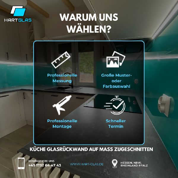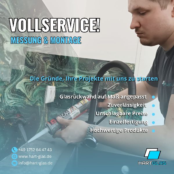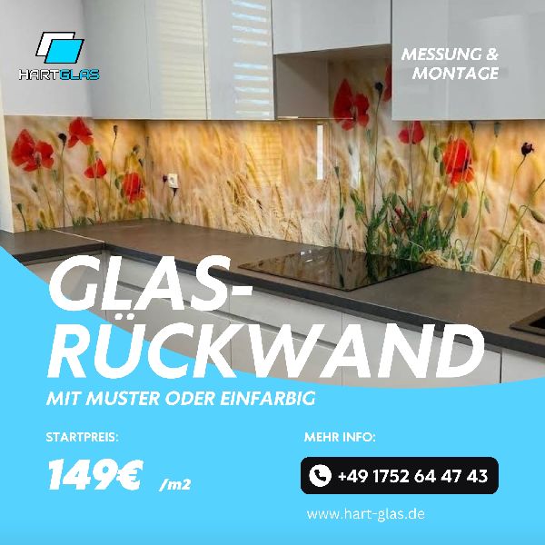 Wir bieten maßgefertigte Glaspaneele für Küchen, Bäder und andere Räume – in Farbe, mit Grafik oder eigenem Motiv. Unser Glas ist zertifiziert, hitzebeständig und pflegeleicht. Dank direkter Zusammenarbeit mit einem polnischen Hersteller liefern wir schnell (3–7 Wochen) und zu Top-Preisen – bis zu 70 % günstiger als viele deutsche Anbieter. Vermessung oft noch am selben Tag möglich. Wir übernehmen Beratung, Aufmaß, Lieferung und Montage – alles aus einer Hand. Seit 2022 stehen wir für persönlichen Service, Qualität und ehrliche Preise. Die positiven Kundenbewertungen bestätigen das.
