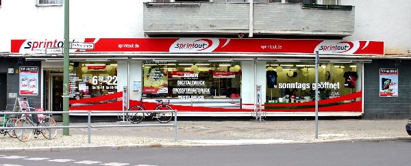 Extrem schnell. Von der Visitenkarte bis zum Messestand – ALLES! Ihre Express-Druckerei mit Scan- & Digitalisierungsservice. Flyer, Falzflyer, Bücher, Broschüren, Klapp- & Postkarten, Poster, Plakate, Tapeten, Aufkleber, PVC-Banner, techn. Zeichnungen, Pläne, CAD-Plots, Klebefolien, Leinwände auf Keilrahmen, RollUps, Werbetechnik, Leuchtkästen, Schilderdrucke, Direktdrucke auf Kunstglas, DiBond, Forex, Kapa, Wabenkarton und Holz. Wir produzieren mitten in Berlin!Einfach vorbeikommen!Kopieren, drucken und scannen; direkt von USB und Smartphone. Fotos am Terminal ausdrucken. Abschlussarbeiten drucken und gleich binden lassen. Plakat- & Posterdruck auf unterschiedlichsten Materialien. Stempelherstellung sofort. Textildruck und Fotogeschenke auf T-Shirts, Jutebeutel, Tassen & noch viel mehr sofort zum Mitnehmen!FlixPrint – der Onlineshop powered by Sprintout.Stellen Sie Ihr Druckprodukt mit nur wenigen Klicks zusammen und lassen Sie Ihren fertigen Auftrag bequem via Stadtkurier oder Paketversand liefern. Gerne können Sie Ihren Auftrag von Montag bis Samstag auch direkt von unserer Druckerei in Berlin-Schöneberg selbst abholen. Superschnelle NOW & EXPRESS Tarife!