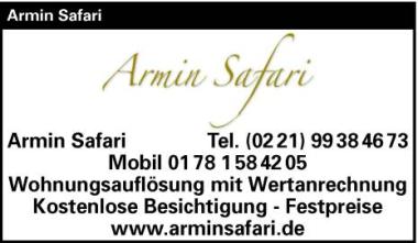 nsere Aufgabe ist es in erster Linie, Ihnen, unseren Kunden, alle anfallenden Aufgaben aus einer Hand abzunehmen. Seriosität und Professionalität stehen bei uns dabei stets an oberster Stelle. Bei uns können Sie von einer absolut fairen Wertanrechnung im gegenseitigen Interesse ausgehen. Unser Fokus liegt auf dem Großraum Köln beziehungsweise NRW, gerne übernehmen wir in Einzelfällen aber auch Aufträge aus dem Um- und Ausland.Darüber hinaus stehen wir Ihnen als versierter und langjährig erfahrener Partner im Umgang mit Antiquitäten zur Seite. Sei es der An- & Verkauf alter oder moderner Kunst, antiker Teppiche, Asiatika, Schmuck und Porzellan oder Möbel verschiedenster Stilrichtungen und Epochen, unser Leistungsspektrum ist flexibel und auf Ihre individuellen Wünsche und Bedürfnisse zugeschnitten.Vereinbaren Sie einen kostenlosen und unverbindlichen Beratungstermin mit uns. Wir freuen uns, von Ihnen zu hören.Tel:0178-1584205Armin Safari