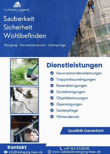 Die Gebäudereinigung Haas bietet professionelle Reinigungsdienstleistungen für Geschäftskunden an. Unser Hausmeisterservice steht rund um die Uhr zur Verfügung, um Ihre Immobilie in bestem Zustand zu halten. Wir kümmern uns um die Gebäudeinstandhaltung, Objektbetreuung, Treppenhausreinigung, Unterhaltsreinigung sowie Büro- und Praxisreinigung. Unser Team sorgt dafür, dass Ihre Räumlichkeiten stets sauber und gepflegt sind. Wir verwenden nur hochwertige Reinigungsmittel und modernste Technologien, um optimale Ergebnisse zu erzielen. Bei uns steht die Zufriedenheit unserer Kunden an erster Stelle, daher legen wir großen Wert auf Zuverlässigkeit, Pünktlichkeit und gründliche Arbeit. Wir sind Ihr Partner für Sauberkeit und Ordnung!