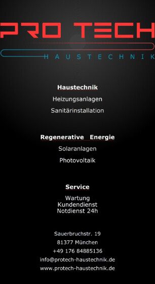 Protech Haustechnik mit Sitz in München steht seit seiner Gründung für hochwertige Lösungen in den Bereichen Heizungsinstallation, Solaranlagen, Photovoltaik, Fußbodenheizungen und Klempnerarbeiten. Unser Anspruch ist es, durch Innovation und bewährtes Handwerk den Komfort und die Energieeffizienz in den heimischen vier Wänden unserer Kunden zu steigern. Dabei legen wir großen Wert auf Nachhaltigkeit und den Einsatz modernster Technologien.
