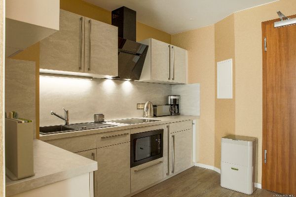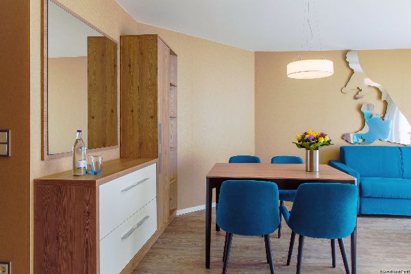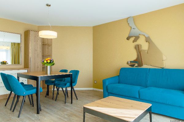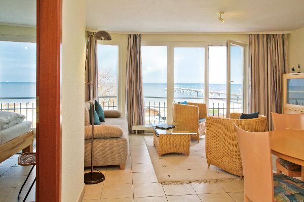Die geräumigen Apartments im Seetel Ostseeresidenz Seeschloss verfügen über eine voll ausgestattete Küchenzeile und ein Marmorbad. Einige Zimmer haben einen Balkon.