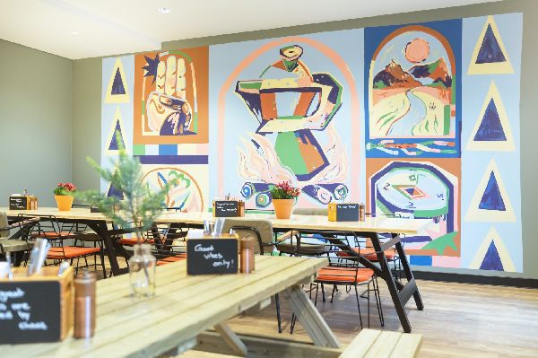 Our Holiday Inn - the niu, Amity Potsdam is centrally located, south of Friendship Island and only 200 metres from the main railway station. Our design hotel combines earthy design elements with state-of-the-art technology. Earthy and green tones, leather, ropes and soft fabrics create a relaxed lodge atmosphere, while flat-screen TVs and Bluetooth sound ensure comfort. The colourful murals by artist JU MU add extra charm. Her fantastic masterpieces, inspired by shamanic cults, nature and human connection, bring an unforgettable style to the hotel.