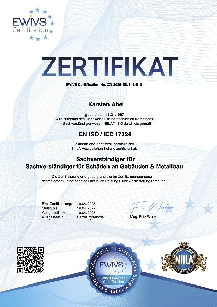 Bausachverständiger für Schäden an Gebäuden und Metallbau. Danke, dass Sie sich für mein umfangreiches Leistungsportfolio interessieren. Neutralität, Integrität und Unabhängigkeit meines Sachverständigenbüros bilden die Grundlage für eine faire und vertrauensvolle Zusammenarbeit. Auf den folgenden Seiten biete ich Ihnen einen Überblick über all meine Fachgebiete und Kompetenzen als Bausachverständiger und Brandschutzbeauftragter an. Ich freue mich, wenn Sie von meinem Fachwissen und Expertise profitieren. Setzen Sie sich einfach mit mir in Verbindung. Ich stehe Ihnen für persönliche Gespräche und individuelle Beratungen gerne zur Verfügung. Zertifiziert nach DIN EN ISO/IEC 17024.