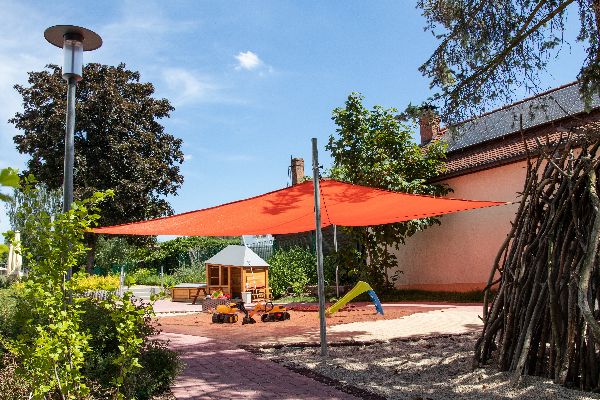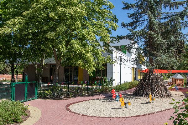 Die Gartenanlage ist naturnah gestaltet und soll den Kindern u.a. die Möglichkeit geben, Gemüse anzubauen, welches in der eigenen Kinderküche gemeinsam zubereitet werden kann. Das großzügige Außengelände mit großem Kletterbereich und Rollerstrecke bietet ausreichend Platz für Bewegung. Zusätzlich befindet sich im Erdgeschoss ein großer Bewegungsraum, der ein vielfältig nutz- und gestaltbarer Bereich für alle Kinder der Kindertagesstätte ist. Der Raum mit dazugehörigem eigenen Terrassen-, Gartenbereich und Teeküche, dient ebenso der Öffnung für Angebote der Begegnung mit Eltern. Neben dem einzelnen Kind ist die Kindertageseinrichtung demnach ein Ort für die gesamte Familie: eben ein Familiengarten.