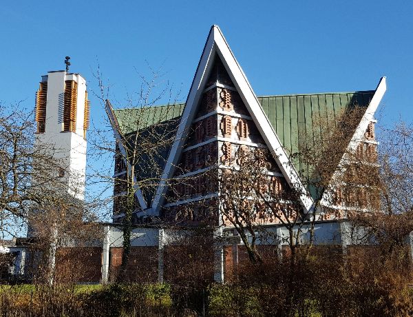 Der Architekt Gerhard Hauss wählte als Dachkonstruktion ein Zeltdach, das auf vier massiven Säulen ruht. Die großen Öffnungen zwischen den Säulen sind teilweise mit Backsteinornamenten sowie teilweise in leuchtenden Farben bleiverglast, und geben, zusammen mit den Lichtritzen im unteren Teil, dem Kirchenraum ein warmes Licht.