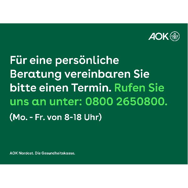 In diesem Servicecenter ist nach einer Online-Terminvereinbarung eine persönliche Beratung möglich, dazu buchen Sie bitte Ihren Gesprächstermin über den Link Termine. Das Online-Portal "Meine AOK" steht Ihnen rund um die Uhr zur Verfügung, um mit der AOK Nordost in Kontakt zu kommen. "Meine AOK" bietet Ihnen die Möglichkeit persönliche Daten zu ändern, zum Beispiel die Adressänderung nach einem Umzug, die Namensänderung nach einer Heirat oder eine Krankmeldung an die AOK Nordost zu senden oder Kinderkrankengeld zu beantragen u.v.a.m..