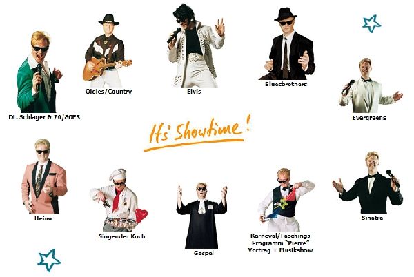 o Musik-Shows (Solo) wie Elvis, Sinatra, Schlager, singender Santa Claus, Sinatra, Bluesbrother, singender Kellner u.v.m.