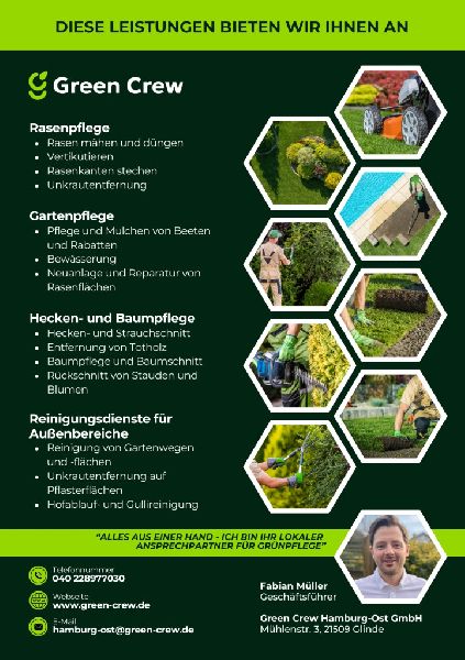 Sie haben eine Idee – wir machen daraus einen Garten, der begeistert. Mit der Green Crew erhalten Sie professionelle Leistungen im Garten- und Landschaftsbau, kombiniert mit verlässlicher Grünpflege. Denn schöne Außenanlagen entstehen nicht nur durch Gestaltung – sondern durch kontinuierliche Pflege.