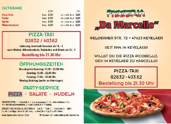 Seit über 20 Jahren in Kevelaer. Willst Du die PIZZA picobello, geh in Kevelaer zu Marcello!