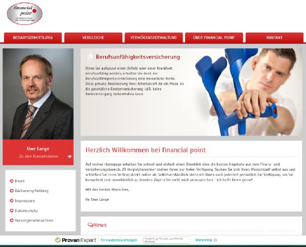 Mein Name ist Uwe Lange und mit der Gründung von Financial Point konnte ich mir 25 Jahren einen persönlichen Wunschtraum erfüllen. Ich freue mich darauf, Sie frei und unabhängig zu möglichen Finanz- und Versicherungsprodukten beraten zu können. Dabei verfolge ich einen ganzheitlichen Ansatz, der alle Aspekte in Sachen Absicherungen und Investitionen angemessen berücksichtigt. Da ich zu 100% selbstständig agiere, kann ich für Sie das Optimum heraus holen. Als Ihr Interessenvertreter helfe Ich Ihnen dabei, die richtigen Lösungen bei Themen, wie der Altersvorsorge oder der Haftpflichtversicherungen, zu finden.