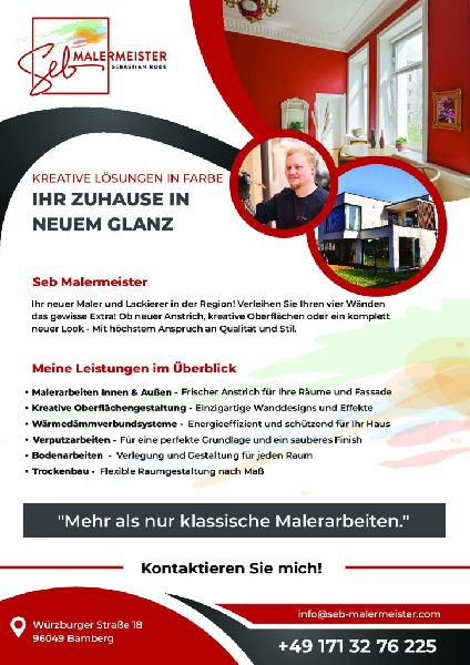Im Herzen von Bamberg gelegen, bietet Seb Malermeister ein umfassendes Spektrum an Handwerksleistungen, die jeden Raum in ein Meisterwerk verwandeln. Als erfahrene Experten in Malerei, Verputz, Tapezierung und darüber hinaus, stehen wir für Qualität und Professionalität. Unsere Leidenschaft für Farben und Texturen treibt uns an, individuelle Lösungen für jede Herausforderung zu finden.