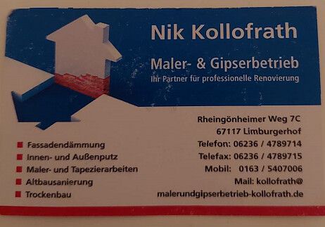 Suchen Sie für Arbeiten im Haus noch einen Dienstleister, der sich durch viel Fachkompetenz auszeichnet? Dann sind wir in Limburgerhof und Umgebung ein passender Ansprechpartner für Sie. Im privaten sowie geschäftlichen Bereich steht Ihnen das Team des Maler- & Gipserbetriebs N. Kollofrath für verschiedene Dienstleistungen zur Seite. Teilen Sie uns Ihre Wünsche mit - wir gewährleisten Ihnen erstklassige Ergebnisse zu einem fairen Preis.