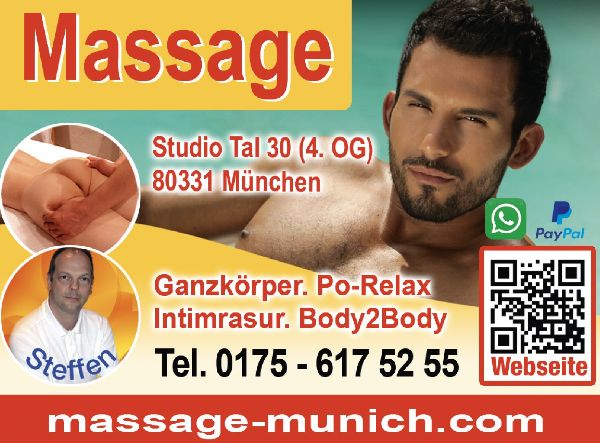 Massage Munich Tal 30, City Massagepraxis im Zentrum von München zwischen Marienplatz und Isartor! Masseur Steffen - Munichs best Massage therapist bietet Ganzkörpermassage, Sportmassage, deep tissue, swedish, lower back pain, sports massage, Rückenmassage, Streichelmassage/ gentle touch, Intimrasur und Fußmassage Thai Style ! Massage Therapy! massage spa near me. Day spa. Aroma Massageöle. Kein Ruhetag! mo-so 9 - 24.00! Faire Preise! Termine nach Vereinbarung! Komfort Massageliege. Malemassage, Gaymassage, Po Relax Massage, Bodytobody ex Tantra, Fesselmassage/ Bondage, Fantasymassage... City Massagestudio! KurzUrlaub vom Alltag! Ich freue mich auf Ihren Anruf/ Messages, Whatsapp - Steffen freut sich auf Anfragen in English oder Deutsch