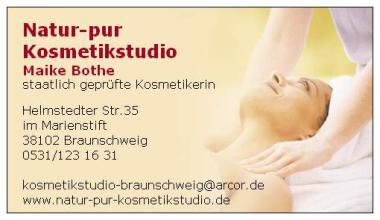 Guten Tag! Bei mir begeben Sie sich in vertrauensvolle Hände, denn Ihr Wohlbefinden profitiert von meiner über 20 jährigen Berufserfahrung als staatlich geprüfte Kosmetikerin. Besonderen Wert lege ich auf eine persönliche und individuelle Beratung. Ich würde mich freuen auch Sie in meinem Kosmetikstudio begrüßen zu dürfen. Ihre Maike Bothe Für weitere Information besuchen Sie bitte die Homepage: www.natur-pur-kosmetikstudio.de
