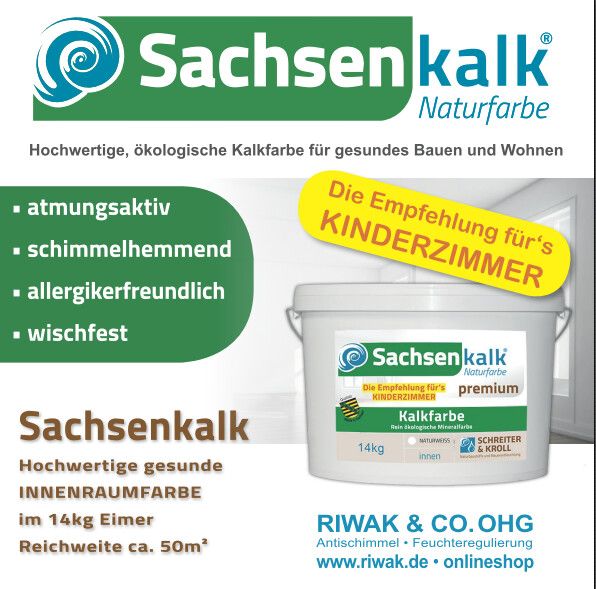 Klima / Kellerentlüftung:o Zuschnitt der durchsichtigen Polycarbonatplatten auf Fenster-rahmengröße (ohne Aufpreis).o Die Platten werden mit einer Stärke von 16mm geliefert. Mit Aufpreis können Sie diese auch in 32mm erhalten!o Alle Lüfter werden induviduell auf Platte montiert und auf Kundenwunsch auf Zu- oder Abluft eingestellt sowie mit einem 3- bzw. 6m-Kabel mit Stecker geliefert. Auf Wunsch können auch andere Längen gefertigt werden.o Bei vorhandenen Mauerdurchbrüchen können wir Ihnen die Fensterlüfter auf Platte und einem weiß vorgestrichenen Holzrahmen (Größe c. 51 x 51 mm) liefern.o Für die Lüfter werden verschiedene Steuerungen angeboten. Z.B. Temperatur- oder Feuchtigkeitsregler mit 2-fach Verteilung auf Platte, Innen- oder/und Außenfühler. Alle Steuerungen sind auf Standartwerte voreingestellt, können aber von Ihnen (mit deutscher Bedienungs-anleitung) oder durch uns auf Ihre Werte eingestellt werden.Schimmelbekämpfung /Vorsorge:o Mit unserem Sortiment RIWAK-Sockelheizung können Sie schon den Anfängen vorbeugen. Die Heizung können Sie auch in einem Rohr oder unter Putz verlegen. Weiterhin ist sie mit fast jeder Farbe überstreichbar.o In der Verbindung mit der Heizung empfehlen wir hier unsere Antischimmelfarbe auf Kalkbasis. Diese kann auch auf Dispersionsfarbe gestrichen werden! Weiterhin ist sie auch mit unseren Abtönfarben in den verschiedensten Farbtönen einzufärben.o Als “normale” Vorsorge empfehlen wir als wichfesten Anstrich unsere Kalkfarbe “Sachsenkalk – Premium”, welche auch entsprechend eingefärbt werden kann. Beide aufgeführten Farben lassen sich gut mit einer Farbrolle auftragen Kondensfeuchte an Fenster und Glastüreno Unser steckerfertiges Sortiment an Fenster- und Türleistenheizungen vervollständigt den Einsatz gegen Tau- bzw. Schwitzwasser an Glasfronten aller Art.o Das selbstregulierende Heizkabel ist in eine Aluschiene eingegossen. Jede Heizung wird einzeln geprüft.o Die Heizungen können auch im begehbaren Bereich des Fußbodens angebracht werden.o Empfohlen wird eine Zusatzsteuerung über eine einstellbaren Temperaturregler mit Steckdose (wenn möglich mit Fühler) z.B. AT-Nr. 150422 oder 150423.Steuerung für Kellerentlüftung / MauertrockenlegungDas “eDRYER”-System Kellerentlüftung und Mauertrockenlegung bilden in vielen Fällen eine Einheit.