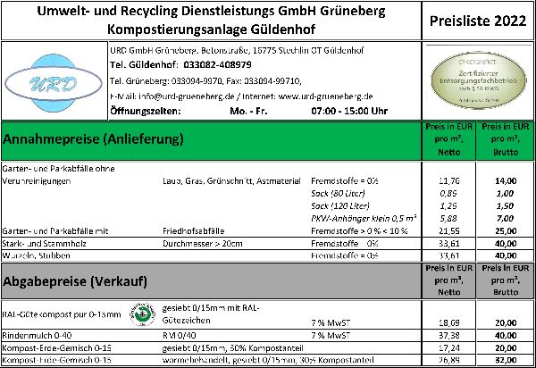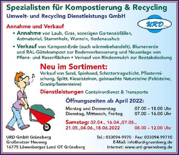 Die Umwelt- und Recycling Dienstleistungs GmbH Grüneberg ist Ihr Abfallspezialist Der Entsorgungsfachbetrieb in Löwenberger Land hat es sich zur Aufgabe gemacht, Privatkunden, Unternehmen und Kommunen umweltfreundliche Recyclingdienstleistungen anzubieten. Zu diesen gehören die Laubentsorgung, die Abfallentsorgung und die Entsorgung von Produktionsabfällen. Die Herstellung von Kompost und Kompostprodukten zählt zu dem Haupterwerbszweig des Unternehmens. Frischkomposte und Fertigkomposte werden dabei zur Düngung und Bodenverbesserung im landwirtschaftlichen Bereich oder im Garten- und Landschaftsbau eingesetzt. Der Entsorgungsbetrieb in Löwenberger Land übernimmt zudem Containerdienste und Baustellenberäumungen sowie Rodungen und den Bodenaushub. Die Umwelt- und Recycling Dienstleistungs GmbH hilft Ihnen aber auch bei der Rekultivierung und Renaturierung. Das Unternehmen sichert für Sie die notwendigen Nachweise, die Sie gegenüber den zuständigen Behörden dafür benötigen. Kommen Sie daher zu dem Fachbetrieb, wenn Sie Rindenmulch, Holzhackschnitzel oder Natursteine brauchen. Der Abfallspezialist aus Löwenberger Land versorgt Sie mit allen Materialien, auf die Sie zur Aufrechterhaltung des landwirtschaftlichen Betriebes angewiesen sind.