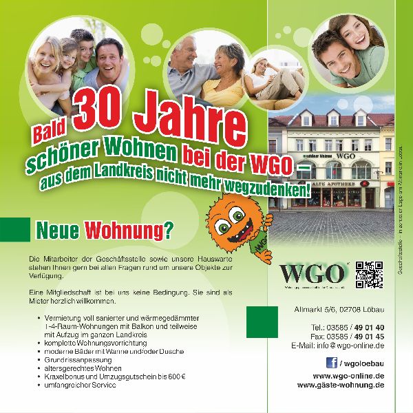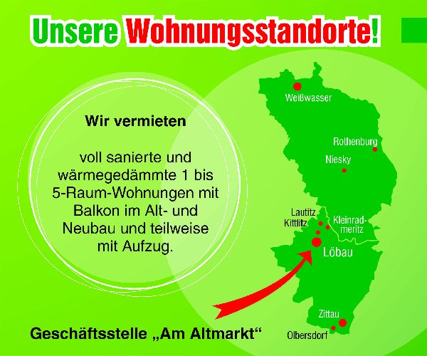 Als Vermieter in der Oberlausitz gibt es uns nunmehr schon seit über 28 Jahren, wobei wir als oberstes Ziel die Zufriedenheit aller Mitglieder und Mieter anstreben. Als einer der größten überregionalen Wohnungsunternehmen in der Oberlausitz haben wir mit ca. 100 Mitgliedern einen Bestand von ca. 1400 Wohnungen in Löbau, Kittlitz, Kleinradmeritz, Lautitz, Zittau, Rothenburg, Niesky und Weißwasser.