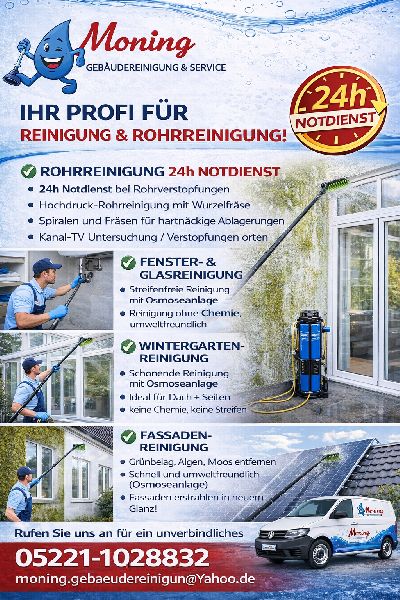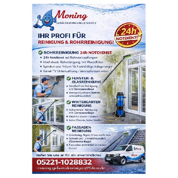 Moning Gebäudereinigung & Service steht für zuverlässige, gründliche und professionelle Reinigungsarbeiten für private, gewerbliche und öffentliche Auftraggeber. Unser Leistungsspektrum umfasst unter anderem Treppenhausreinigung, Büro- und Unterhaltsreinigung, Grundreinigung sowie individuelle Serviceleistungen nach Kundenwunsch. Wir legen großen Wert auf Sauberkeit, Pünktlichkeit und ein faires Preis-Leistungs-Verhältnis. Durch flexible Einsatzzeiten und persönliche Betreuung gewährleisten wir dauerhaft gepflegte Objekte und zufriedene Kunden in Herford und Umgebung.