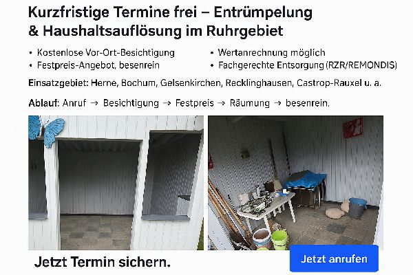 Professionelle Entrümpelung & Haushaltsauflösung in Herne, Bochum, Gelsenkirchen und Umgebung. Fairer Festpreis, kostenlose Besichtigung, schnelle Termine, Wertanrechnung und besenreine Übergabe.