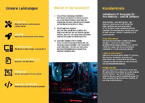 HI Tec Solutions OHG ist Ihr kompetenter Partner für Computerdienstleistungen in Dornburg. Mit über 25 Jahren Erfahrung bieten wir professionelle Reparaturen, Wartungen und Installationen von Computern. Unsere Leistungen umfassen ebenfalls den Verkauf von Antivirenprogrammen und Datenrettung. Als lokale Experten legen wir großen Wert auf Kundenzufriedenheit und individuelle Beratung. Vertrauen Sie auf unsere Fachkenntnisse, um Ihre IT-Probleme schnell zu lösen. Kontaktieren Sie uns gerne für weitere Informationen.